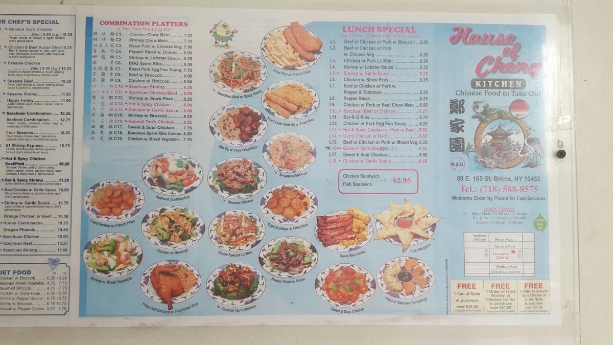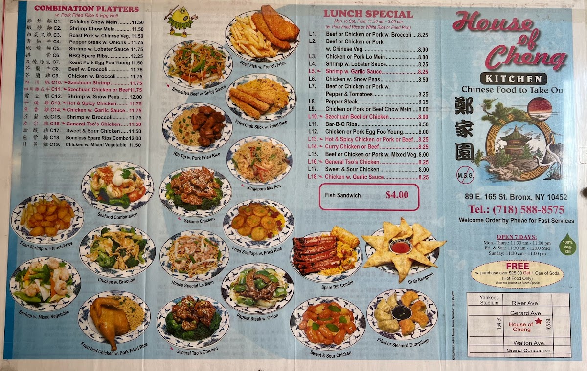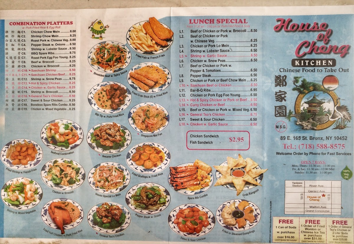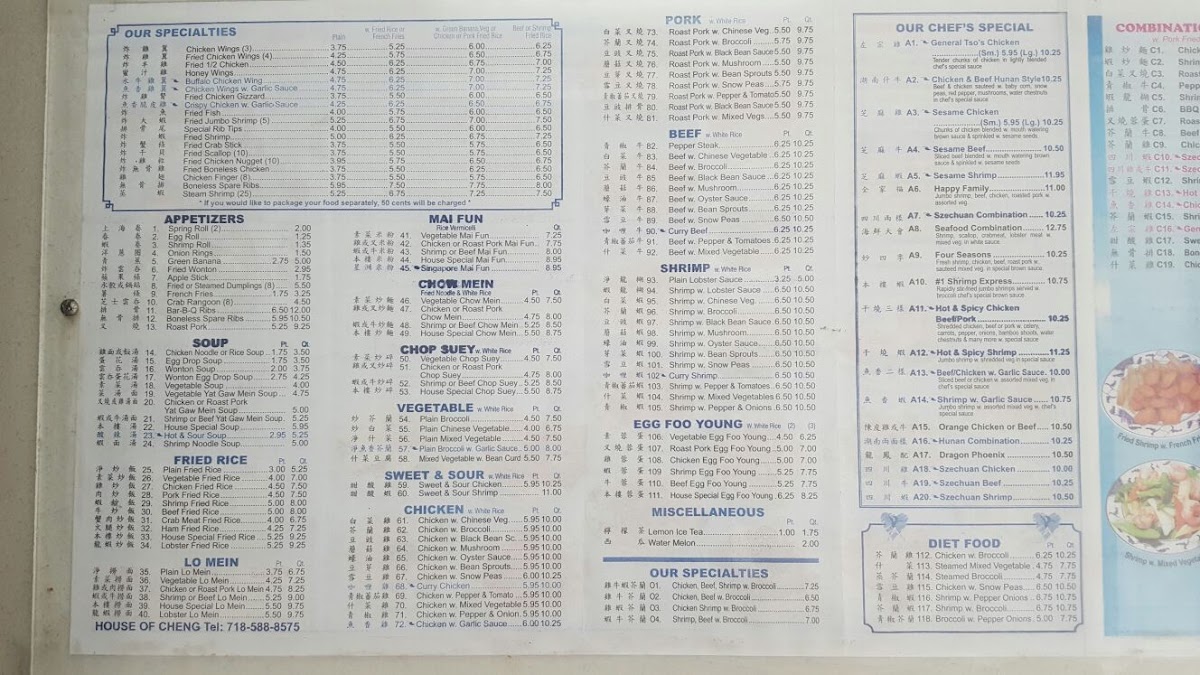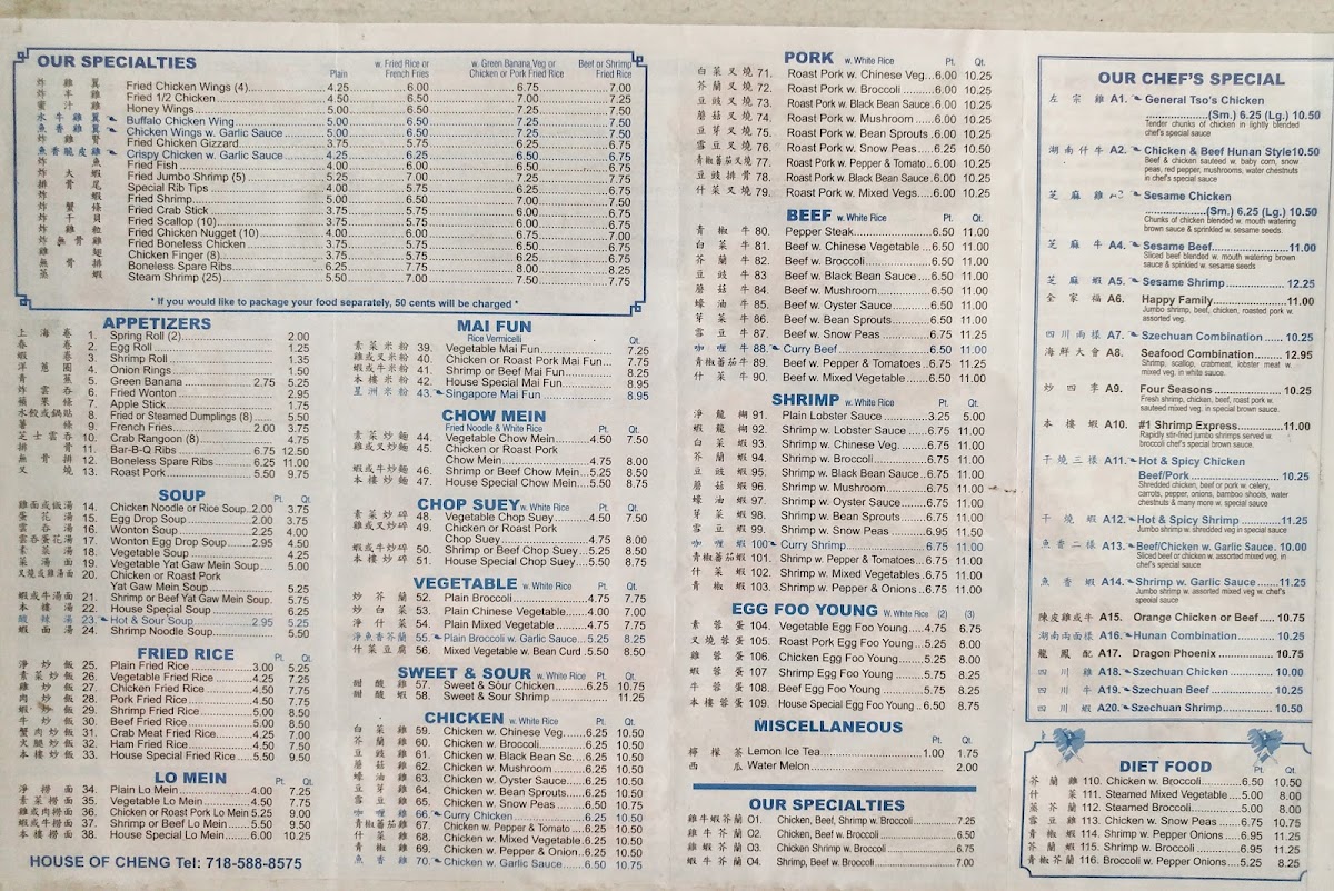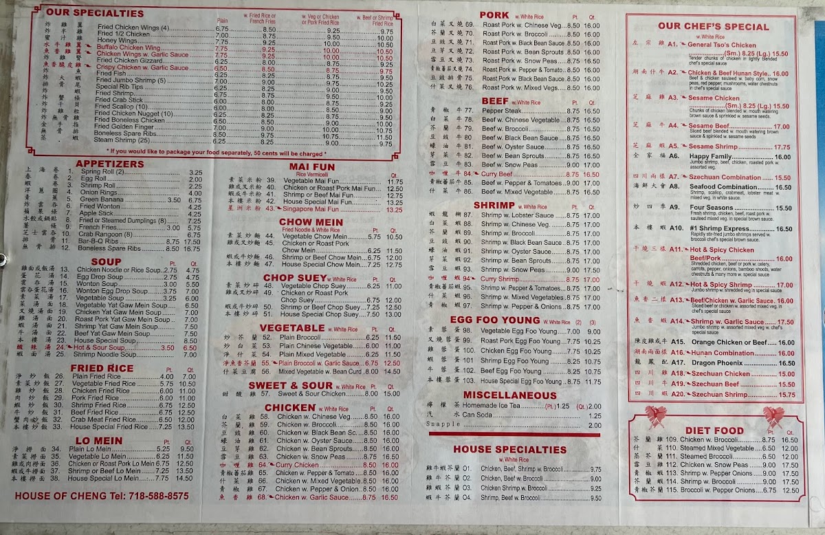 From a reviewer’s perspective, the menu at House Of Cheng offers a wide range of classic Chinese-American dishes at affordable prices, with popular combination platters like Chicken Chow Mein, Shrimp Chow Mein, Roast Pork W. Chinese Veg, Shrimp W. Lobster Sauce, and BBQ Spare Ribs providing satisfying variety. The lunch specials are especially appealing, featuring options such as Beef Or Chicken Or Pork W. Broccoli, Chicken Or Pork Lo Mein, Shrimp W. Lobster Sauce, Chicken W. Snow Peas, and Beef Or Chicken Or Pork W. Pepper & Tomatoes, making it a convenient midday choice. Health-conscious diners can look to the diet section with lighter dishes like Chicken W. Broccoli, Steamed Mixed Vegetable, and Shrimp W. Pepper Onions. The menu also includes sweet and sour favorites like Sweet & Sour Chicken, vegetable dishes such as Plain Broccoli W. Garlic Sauce and Mixed Vegetable W. Bean Curd, and classic entrées including Chicken W. Mushroom - 6.25, Roast Pork W. Black Bean Sauce - 6.00, and Roast Pork W. Bean Sprouts - 6.00. Chef’s specials like General Tso’s Chicken, Sesame Chicken, Sesame Beef, Chicken & Beef Hunan, and Happy Family round out the selection, giving the menu a good balance of familiar favorites and hearty specialties at reasonable prices.